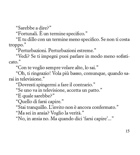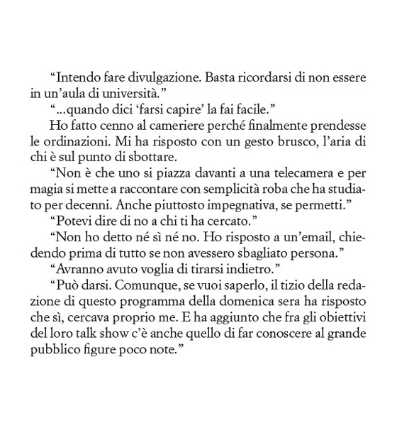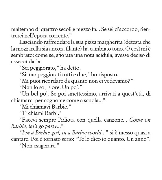 Vale per Mauro quello che scrive Natalia Ginzburg nelle Piccole Virtù: «al centro della nostra vita sta il problema dei nostri rapporti umani»; e del resto per chi non è così? Il fuoco del suo mondo interiore non riesce a scongelare i gesti, le parole. A tormentarlo è l’immagine che gli altri si sono fatti di lui, i ricordi che gli altri hanno di lui, o peggio ancora i ricordi che non hanno di lui — come Luca Sérgola, lo studente a cui Barbi ha fatto il supplente di Storia, e che si è completamente dimenticato di lui —; come porre rimedio a questa asimmetria dello sguardo? all’oblio a cui ci condannano gli altri?