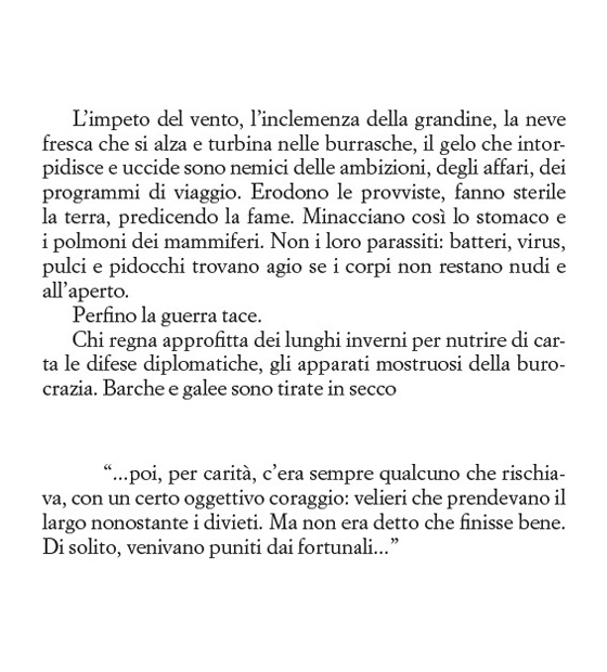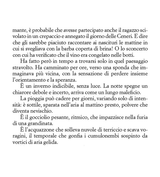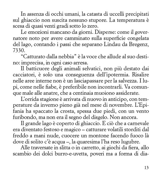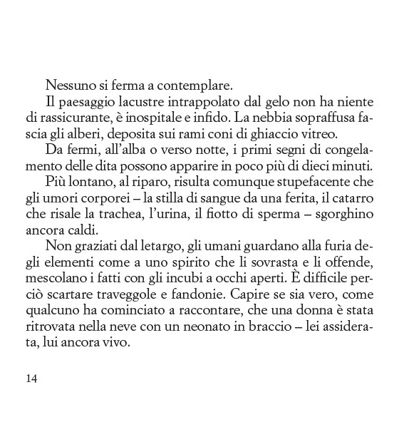 Ma la distopia è già avvenuta, e riguarda il passato: il congelamento del Lago di Costanza durato sei mesi, dal 1572 al 1573. Intorno a questo lago, e al suo portato simbolico, prendono le mosse due narrazioni, a prima vista opposte, non solo perché ambientate in secoli diversi, ma perché raccontate con una lingua sorprendentemente mutevole a seconda che a “parlare” sia il paesaggio senza umani che apre il libro o l’umano troppo umano Mauro Barbi che a quel lago ha dedicato anni di studio, trascurando, a quanto pare, gli umani che gli stavano intorno: «E smettila, Mauro, ti prego, smettila. Tu e quel lago ghiacciato del cazzo!».
