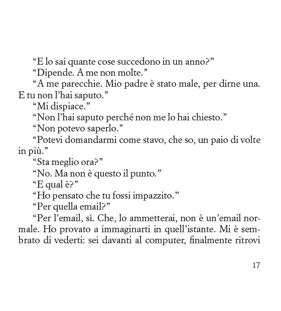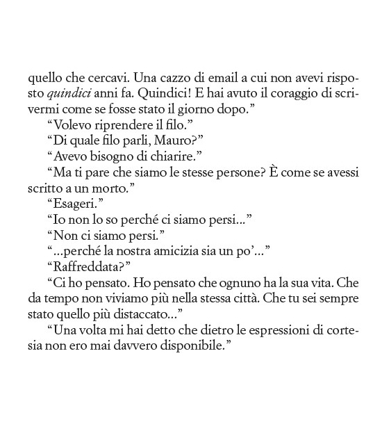 Alla freddezza che gli amici, gli ex compagni di classe, le fidanzate, le amanti gli continuano a rinfacciare, Mauro — come in un film di Nanni Moretti, non a caso citato sul finale — cerca di rimediare rispondendo a e-mail con quindici anni di ritardo, telefonando, o semplicemente ristabilendo un dialogo, il più delle volte immaginario, con quella che definisce gente della sua vita: «Scusa, come va, grazie, volevo solo sentirti, com’è che ci siamo persi?».