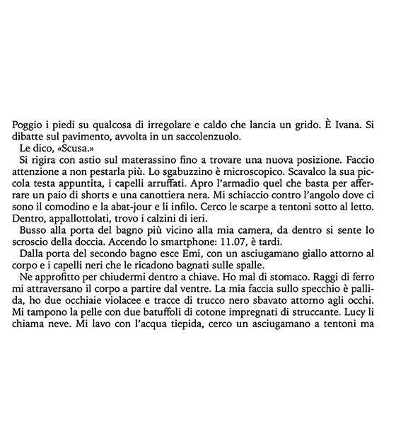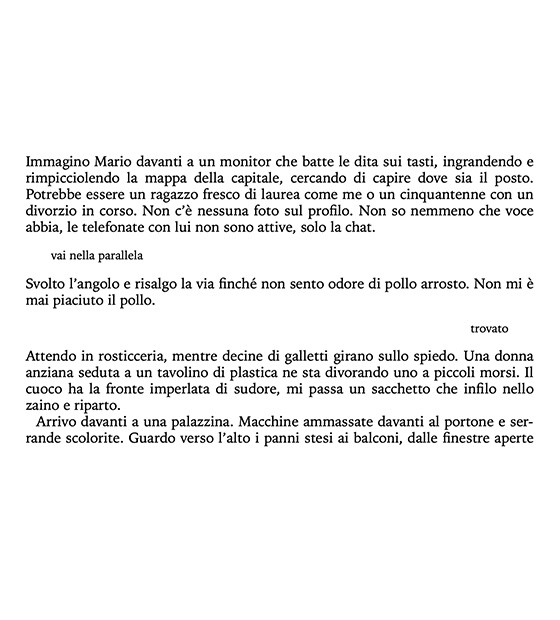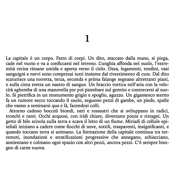 Perché la capitale è carne, inizia a capire Chiara, è una distesa di pelle piena di ferite, con mille occhi che ti spiano. La capitale è un corpo, fatto di corpi affamati che si divorano l’un l’altro.