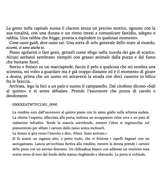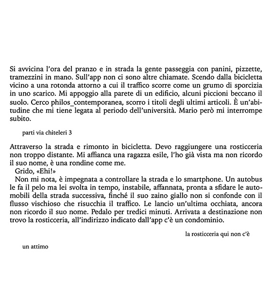 Chiara si è trasferita nella capitale da meno di un anno, con i libri di filosofia dell’università e la felpa che sua sorella le ha raccomandato di indossare. Dopo uno stage non rinnovato, si ritrova in una stanza piena di aspiranti rondini per Envoyé, colosso del food delivery. Quello delle rondini è un lavoro che è quasi un gioco, le viene detto: più accumuli punteggio, più guadagni.
