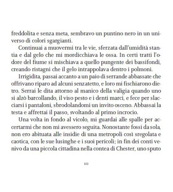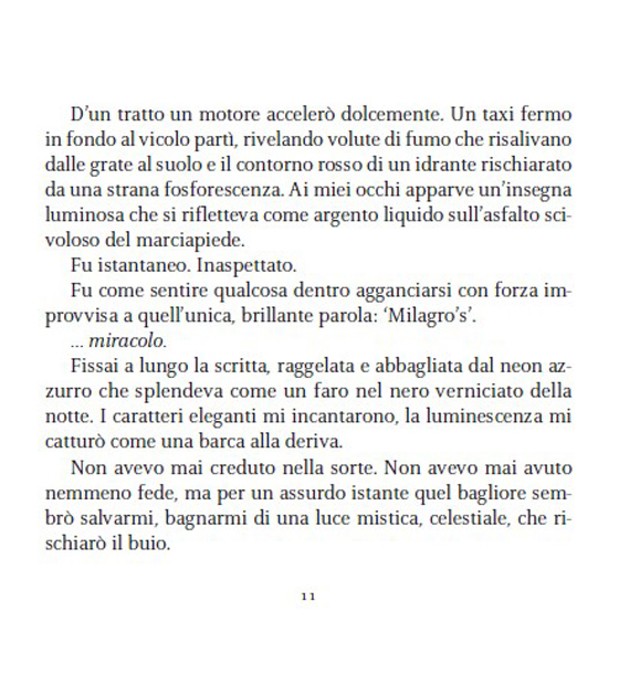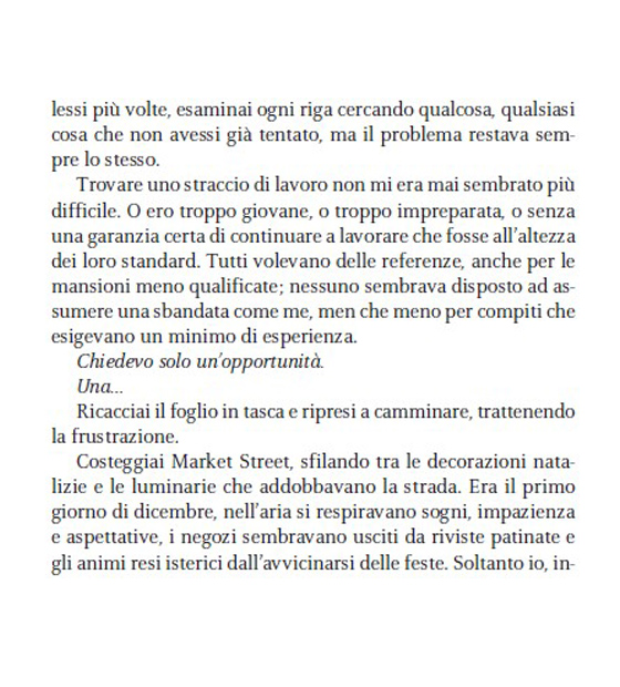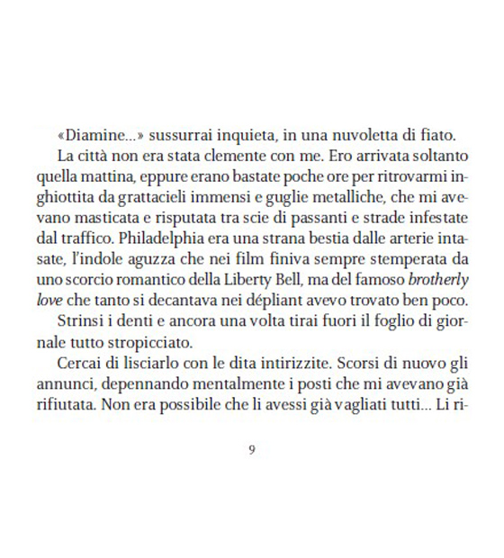 Perché l’amore non è qualcosa di definito. Tutti sanno che cos’è, ma nessuno conosce davvero i suoi confini. Per qualcuno è un sapore. Per altri, un profumo. Per me, l’amore era una cicatrice ricurva sulla pelle, in un punto preciso sotto il costato sinistro. Era uno squarcio bianco che non sarebbe guarito mai. La metà di un cuore non finito. E io l’avrei sempre portata addosso. Come uno stigma