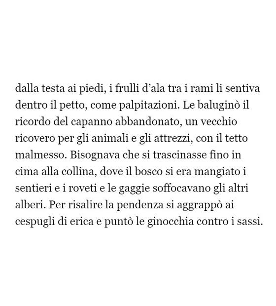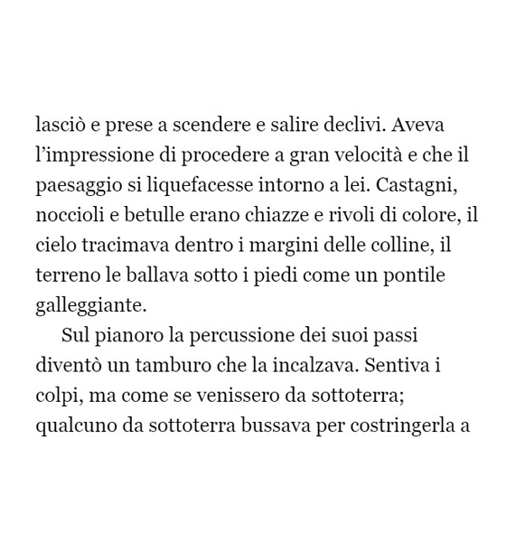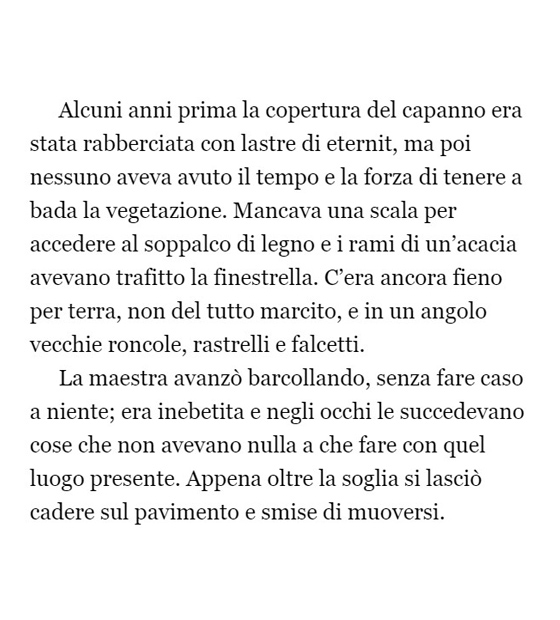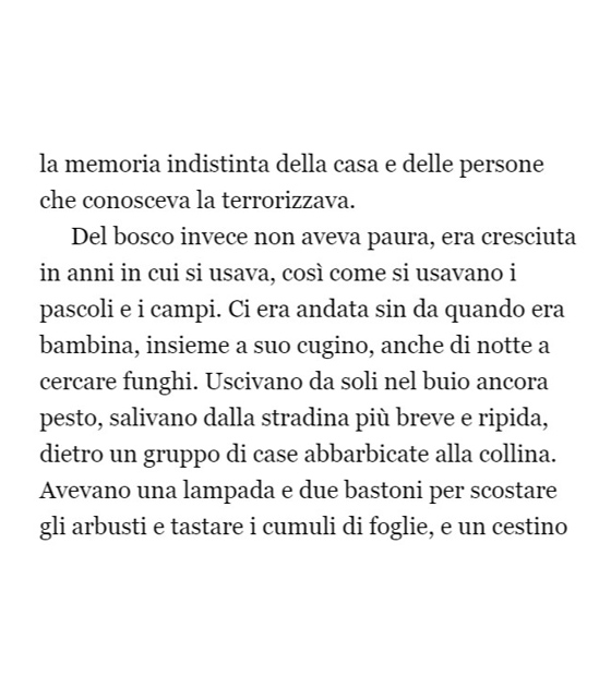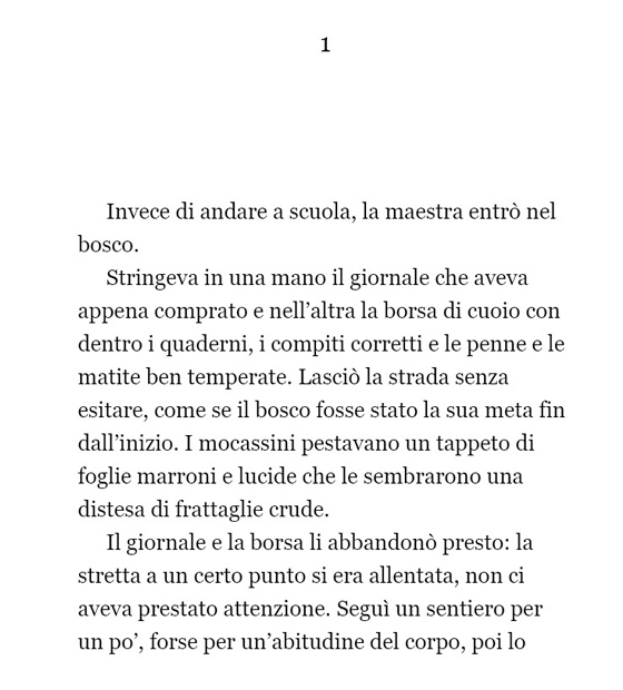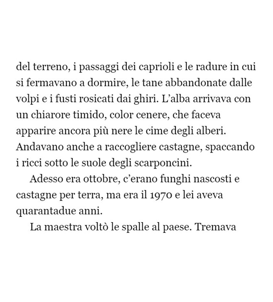 Invece di andare a scuola, la maestra entrò nel bosco. Stringeva in una mano il giornale che aveva appena comprato e nell’altra la borsa di cuoio con dentro i quaderni, i compiti corretti e le penne e le matite ben temperate. Lasciò la strada senza esitare, come se il bosco fosse stato la sua meta fin dall’inizio. I mocassini pestavano un tappeto di foglie marroni e lucide che le sembrarono una distesa di frattaglie crude