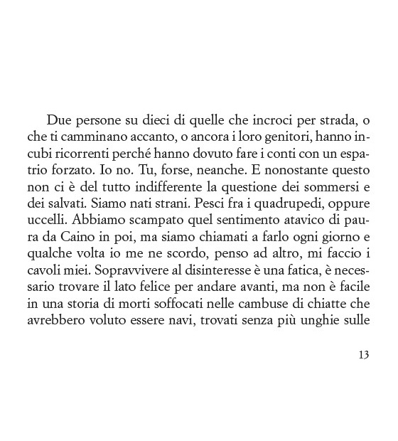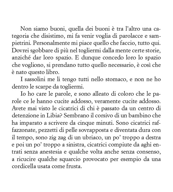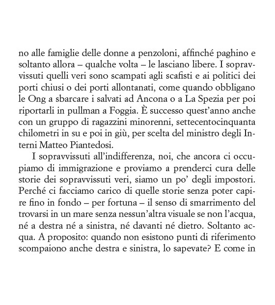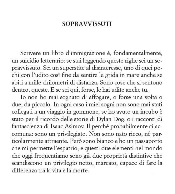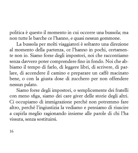 Non si accoglie per religione, credo, pietà o fede. Non si accoglie neanche per convenienza o ragionamento. In fondo non si accoglie neanche perché ne hanno diritto, o pensiamo ce l’abbiano. Si accoglie perché sono esseri umani, e noi siamo esattamente quella stessa cosa che sono loro. Perché in qualche modo stiamo affogando anche noi, insieme a loro, ogni volta in mezzo al mare.