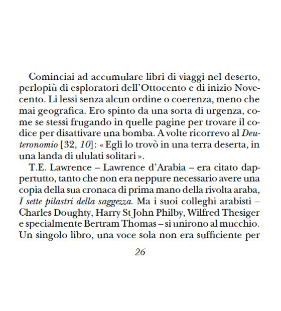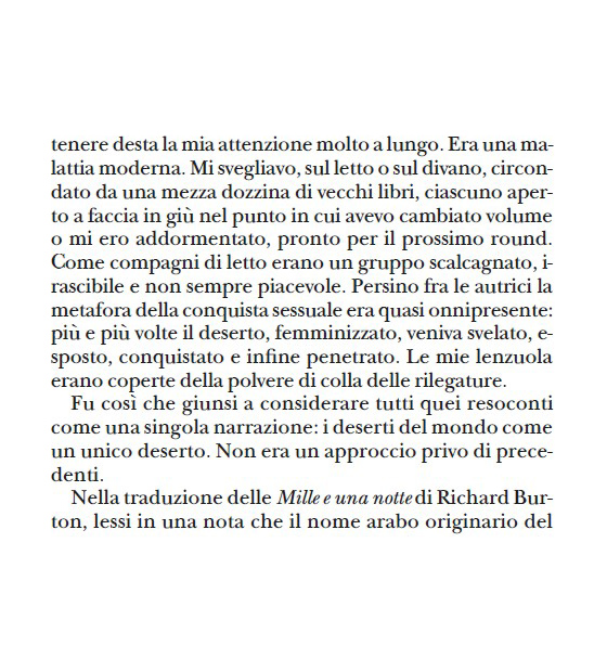 Scoprii di essere attratto dall’anarchia del deserto: non solo perché lì ogni norma poteva considerarsi sospesa, ma perché, in assenza di regole e di giudizi, l’idea stessa del “bene” perdeva ogni significato
