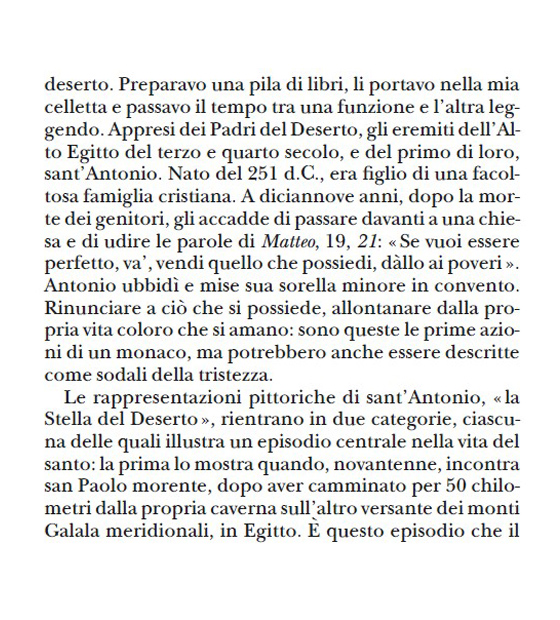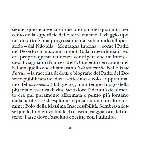 Interrogandosi sull’attrazione che da sempre esercita sull’uomo, Atkins riflette su cosa sia davvero il deserto, sulle sue tante declinazioni fin dall’antichità: santuario di ricerca del divino oppure condanna all’esilio per criminali, zona fertile di simboli e storie oppure barriera invalicabile. Dal prologo fino all’ultimo capitolo, comunque, l’autore ci ricorda che il deserto è prima di tutto quel regno in cui i confini sfumano, e chi vi transita non può far a meno di mettere in discussione certezze e principi: