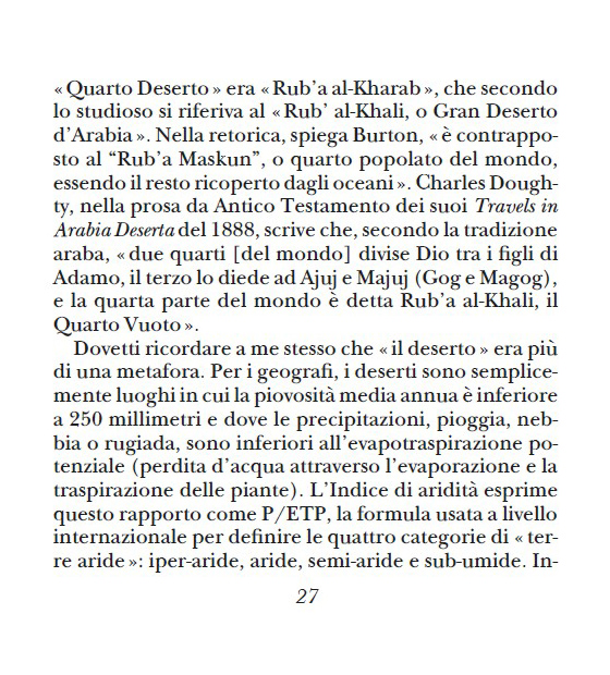 Tra memoir e saggio, la raccolta contiene sette viaggi nelle regioni desertiche più remote ai quattro angoli del pianeta: il Quarto Vuoto in Oman, il Gran Deserto Victoria in Australia, il deserto del Gobi e il Taklamakan in Cina, l’Aralkum in Kazakistan, il deserto di Sonora e il Black Rock negli Stati Uniti e il Deserto Orientale in Egitto. Sette regioni che presentano una flora e una fauna specifiche, ma anche differenti sfide a livello socio-politico e ambientale. Il volume è arricchito da mappe delle aree, fotografie e riproduzioni di dipinti.