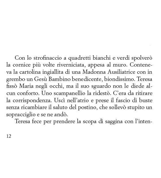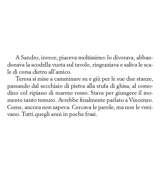 Teresa, la protagonista del romanzo, lavora come donna di servizio per la famiglia di origini ebraiche Levi Minzi, con cui ha un rapporto affettuoso e di amicizia. In particolare, con la padrona della casa alla quale, in virtù di questo sentimento amorevole che le lega, fa una promessa cui dovrà dedicarsi per il resto della vita: durante la Seconda guerra mondiale, infatti, la donna è portata via in una retata della polizia, ma prima di essere arrestata affida a Teresa il suo bambino ancora in fasce supplicandola di salvarlo. Qualcuno però fa la spia, e Teresa viene separata a forza dal bambino e per punizione rinchiusa in manicomio.