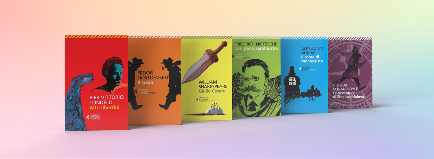 I colori dell'arcobaleno del Pride nelle copertine dei libri della collana Universale Economica Feltrinelli